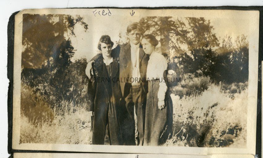 Appears to be the same event as MOORER 24, 26, 28, 30, and 31. Three people standing in a field of sagebrush with pine trees in background. The man in the center has his arms around the women on either side of him. Unidentified woman on left, Fred Moore in center, and an unidentified woman on right.Collection