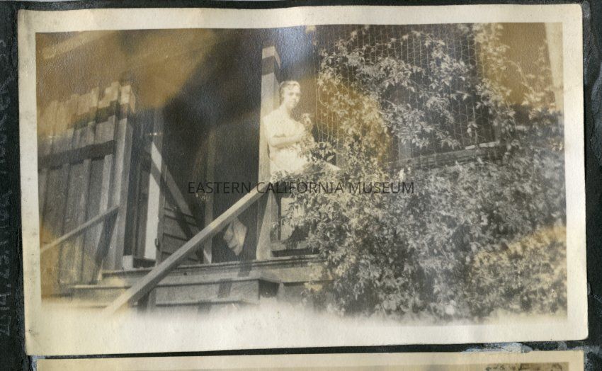 Woman and dog sitting on the railing of a porch in front of a wooden house. There is a a vine plant growing up a bit of lattice work or screen mesh to create an arbor over the porch.Collection
