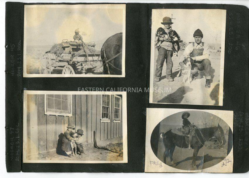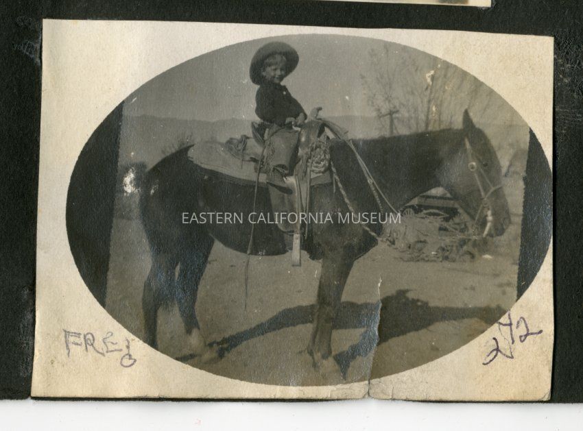 Young child sitting astride a saddled horse, but the stirrups are far beyond the reach of his short legs. Handwritten label identifies the boy as Fred Moore, maybe around the age 2 1/2.Collection