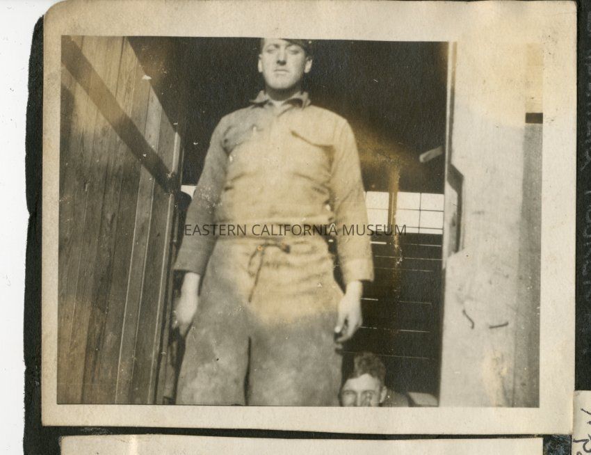 Unidentified man standing inside a wooden building (stable? blacksmith shop?) wearing a blacksmith apron. At the bottom of the photo is the head of another person, also unidentified.Collection