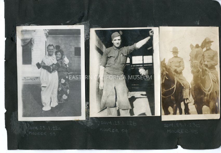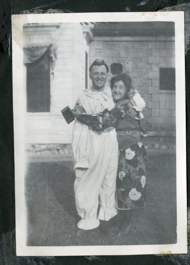 A young couple dressed up in costumes embracing in front of a building (the courthouse and jail or vault?). Man on the left (Fred Moore?) dressed as a clown. Woman on right might be dressed as a gypsy--her skirt has a pattern of large flowers.Collection