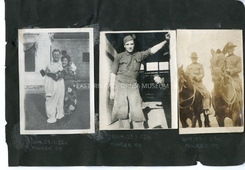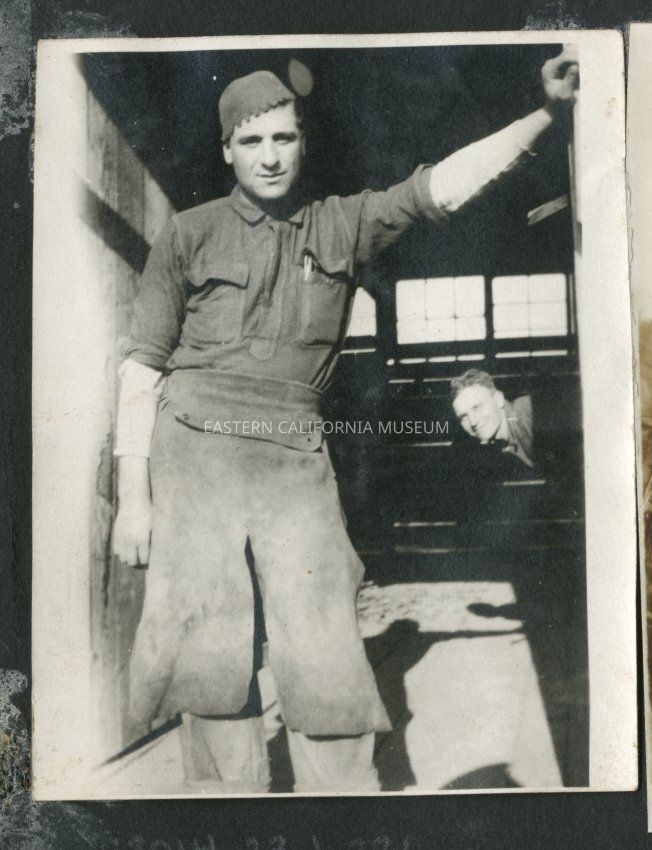 Man standing in the doorway of a stable or blacksmith shop. He is wearing a funny hat and has a cigarette in his mouth. He is also wearing a blacksmith's apron. There is another man poking his head into the photo from the right side.Collection