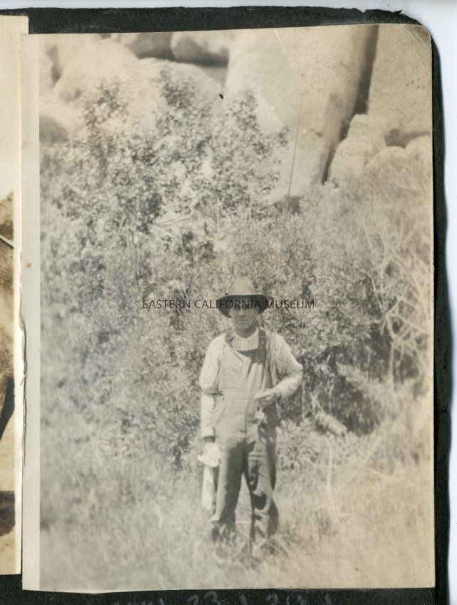 Man wearing ovralls and holding a fishing pole standing in the brush with large boulders or rocks in bakground.