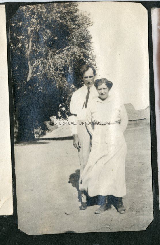Unidentified man and woman standing in a cleared dirt area with a tree and wooden structure (barn?) in background.