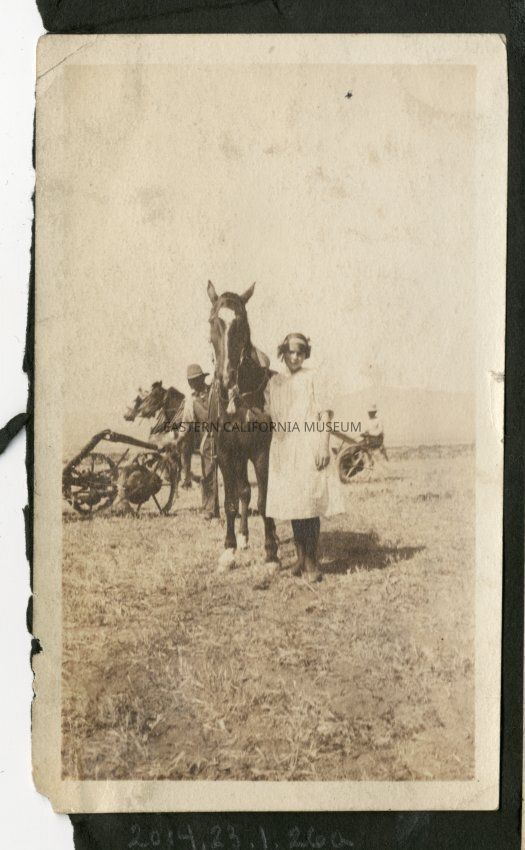 Photo of a young girl standing next to a horse. Men, horses, and farm equipment in background.
