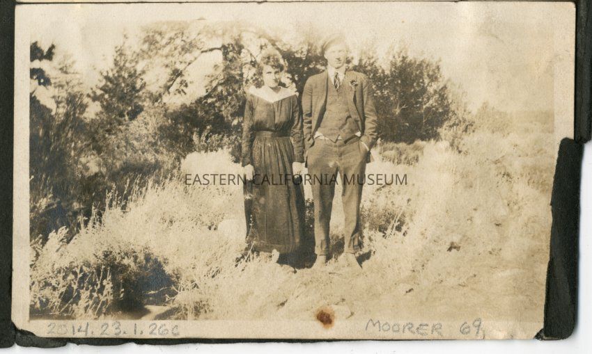 Woman and man standing in field with sagebrush, trees around. Same woman in MOORER 69.