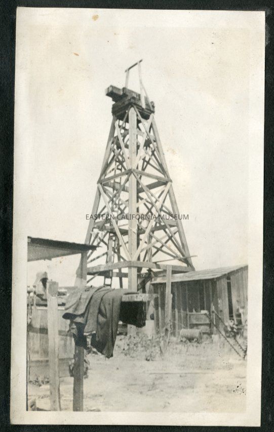 Wooden water or oil tower (not a windmill) with a wooden structure at base.
