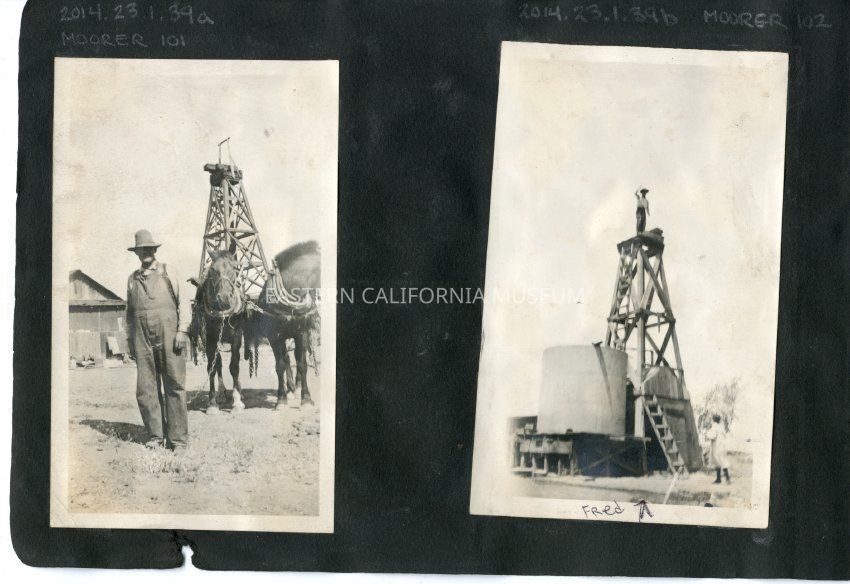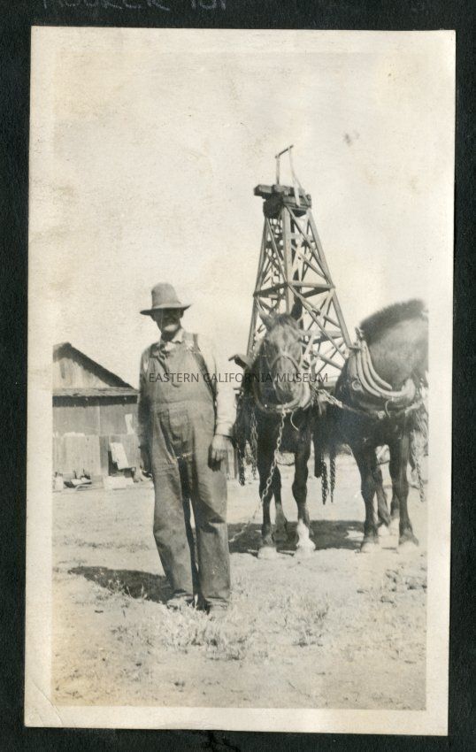 Man wearing overall standing in front of the wooden water or oil tower with horses in the background.