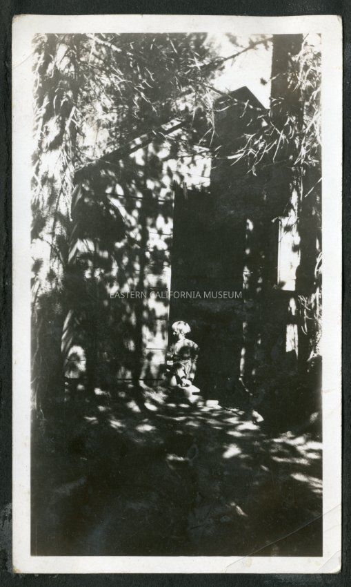 Dark photo of a young child (boy?) sitting in the doorway of a wooden structure sourrounded by pine trees.