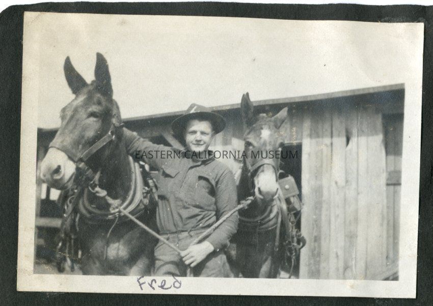 Fred Moore posing between two harnessed horses with a wooden structure (barn?) in the background.