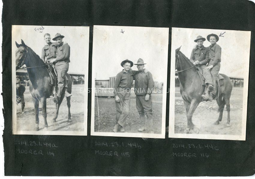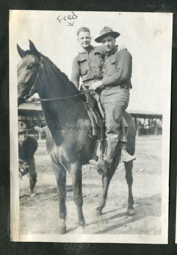 Fred Moore (left) and another unidentified man both astride a horse. There is a third man behind and to the left who has jumped into the picture. Obviously the fellows are playing or "horsing" around. Structure behind them may be stables.Collection