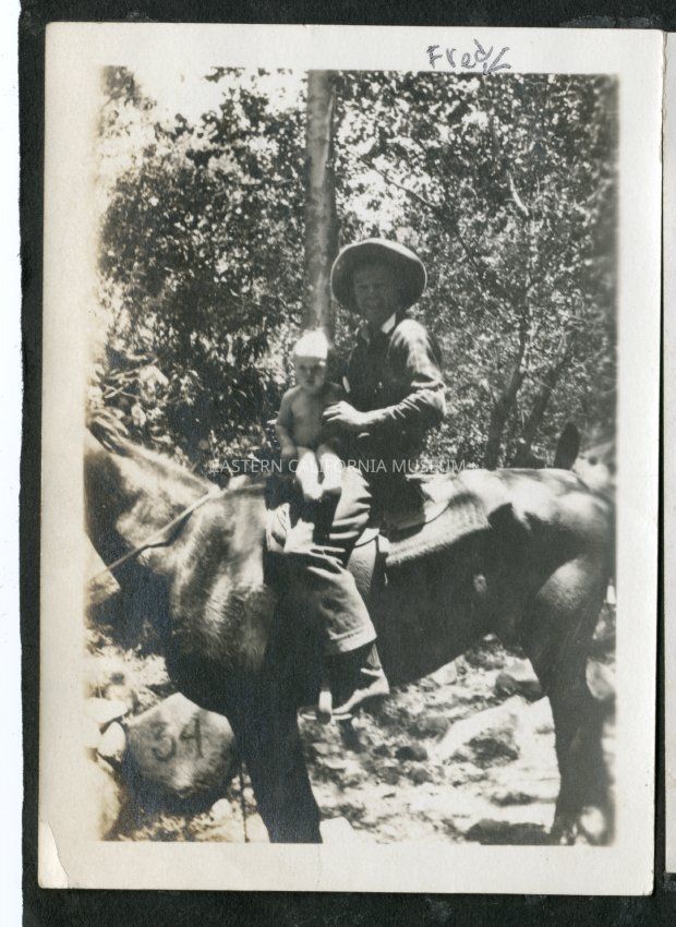 Fred Moore (right) sitting astride a horse holding a (mostly?) naked baby in lap. Trees (aspen?) behind them. There is a rock in the lower left corner with "34" written on it.Collection