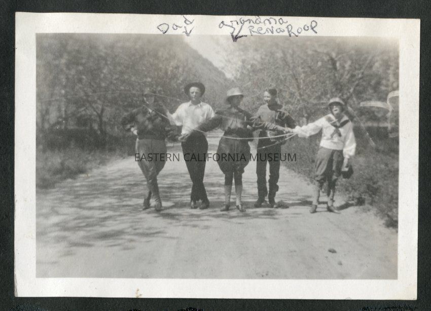 Five people standing in the middle of a road with hands and arms intertwined. They may also be draped in rope. Second from left is Fred Moore and woman in the middle has been identified as "Grandma Rena Roop."