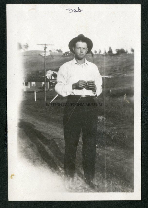 Fred Moore standing in a road with hills, power line, and houses in background.