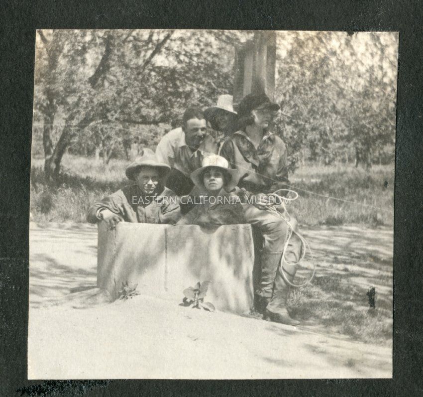 Similiar to photo MOORER 128. Group of five people posing near and in what looks like a concrete pipe. In the back are Fred Moore, Rena Beth Moore, and an unidentified person sitting on the edge of the pipe holding a length of rope. Crouching or sitting in the pipe are an unidentified person and Grandma Rena.Collection