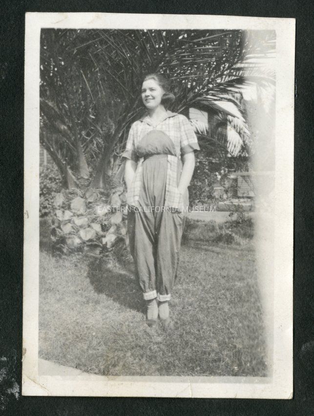 Unidentified young lady posing with her hands in her pockets in front of what might be a Canary Island Date Palm tree.