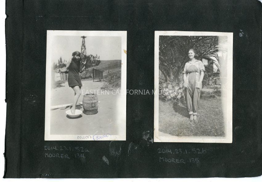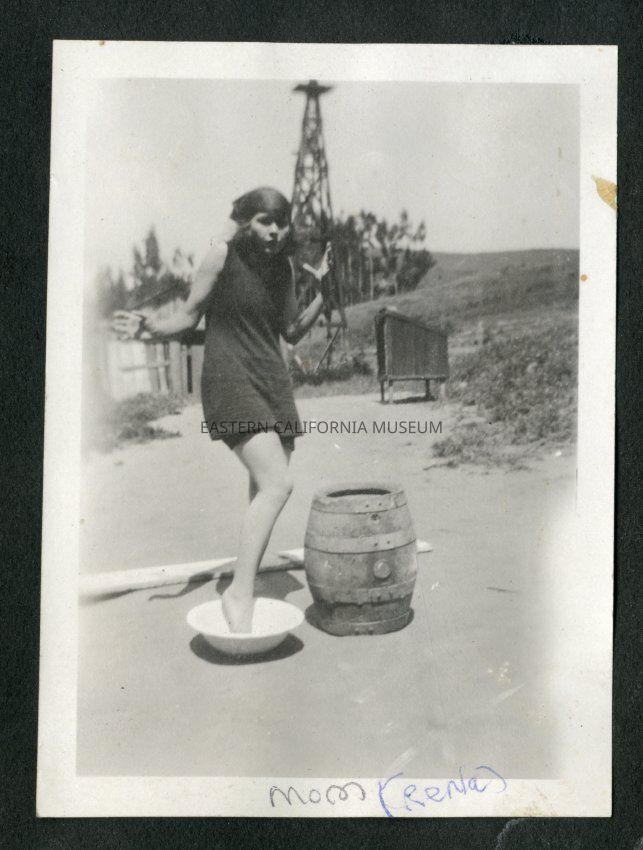 Rena Beth Moore posing in a short black dress with one foot or toe dipped in a bowl. Also in the image are a barrel, wooden structures, and a windmill or rig in the background.Collection