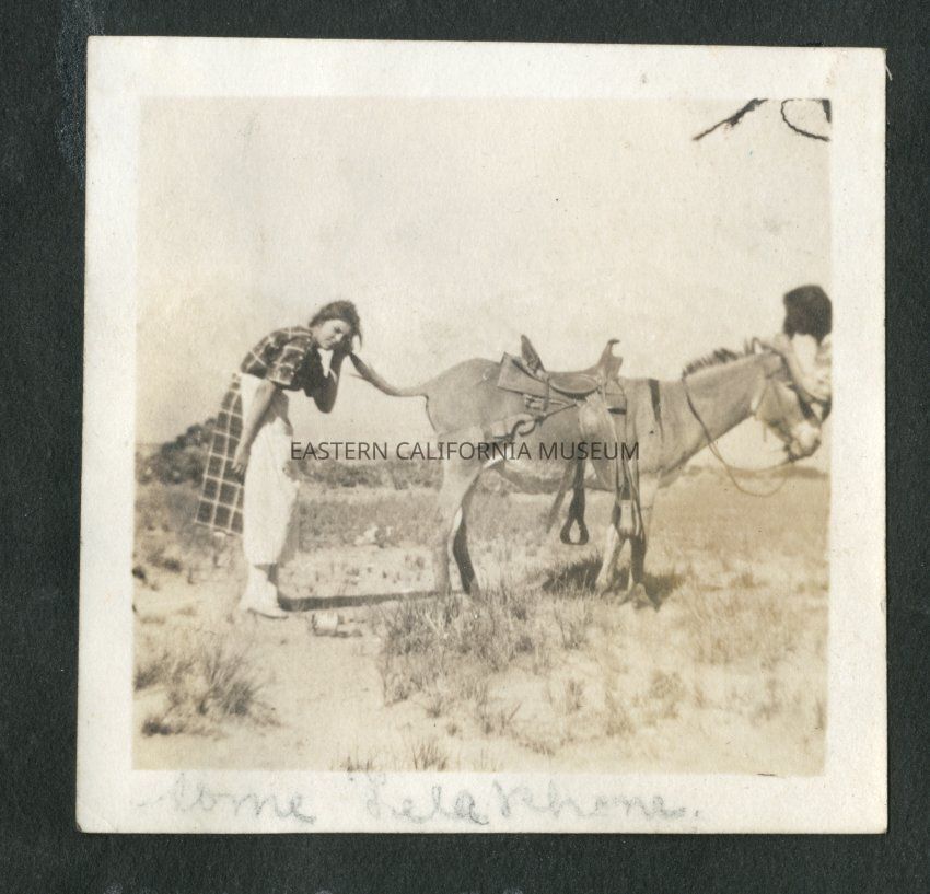 Two people playing "telephone" by talking into the ear of a saddled donkey/mule/burro/whatever and one listening to its tail. The caption on the bottom of the photo is handwritten in pencil and says, "Some telephone."