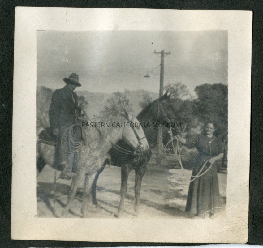 Man mounted on a grey or white horse while a woman stands beside him holding the reigns to another horse. Power lines visible in background.