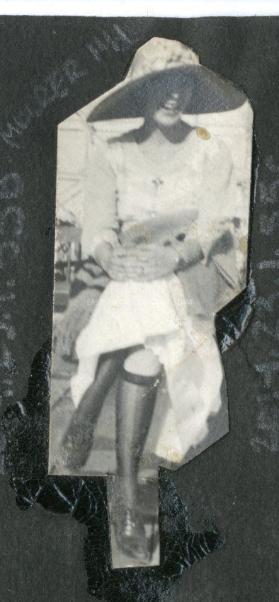 Unidentified woman sitting with her legs crossed wearing a white dress, knee high stockings, and large floppy hat.