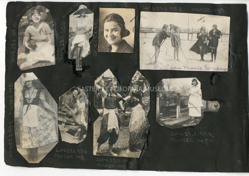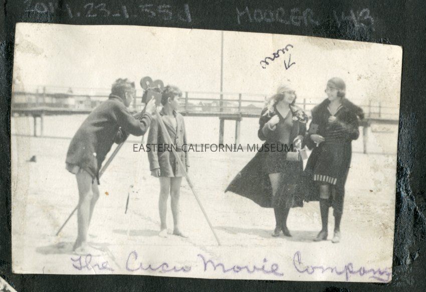 Great photo that has been captioned with, "The Cuco Movie Company." Two boys filming two girls who are in costume. The woman on the far right is unidentified, but the other woman is Rena Beth Moore. There appears to be a boardwalk or pier or raised walkway behind them--maybe they are at the beach?Collection