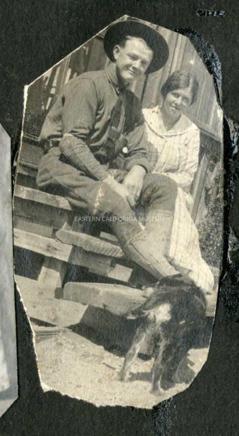Fred Moore sitting on wooden steops with an unidentified woman and a dog.