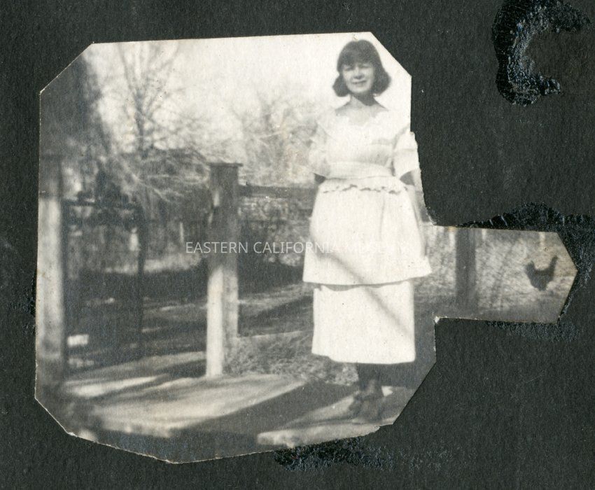 Unidentified woman (maybe Rena Beth Moore?) standing next to a chicken coop. The photo has been irregularly cut so as to include a chicken to the far right.Collection