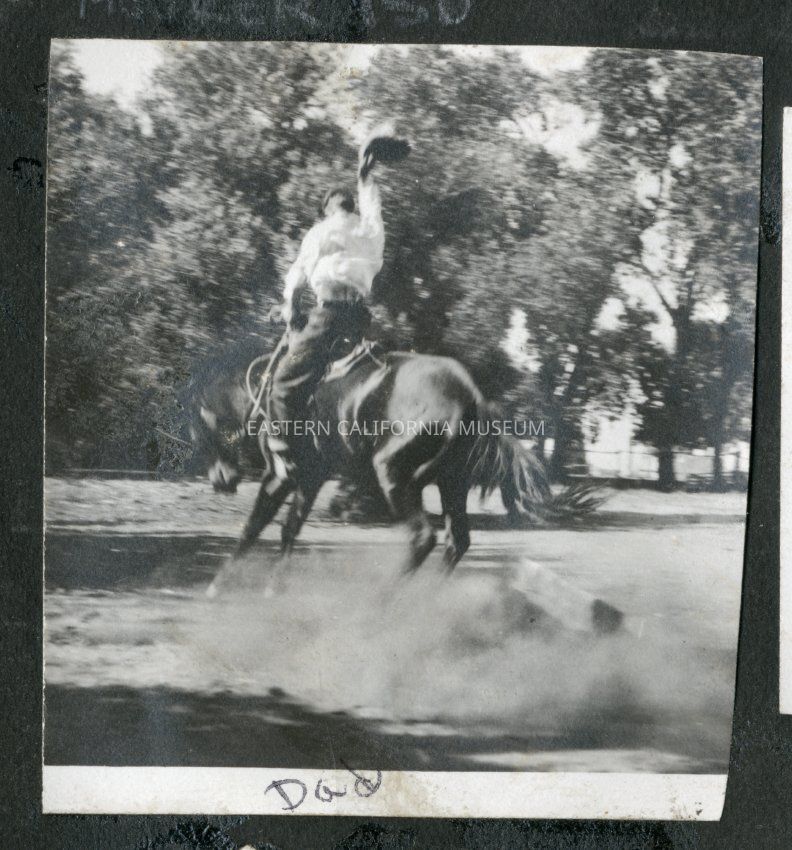 Fred Moore riding a bucking black horse in the traditional pose with his hat held in one hand above his head. Similiar to MOORER 281.