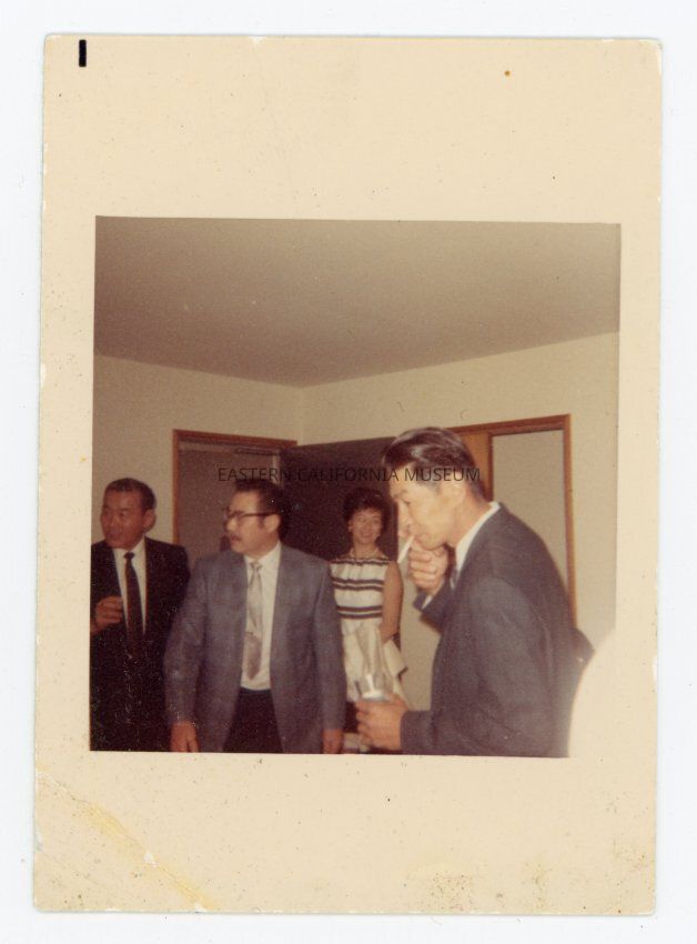 Interior photo of four people (three men, one woman). This photo was found in a group of 16 other photos, and the people are thought to be members of the Nomura family.Collection