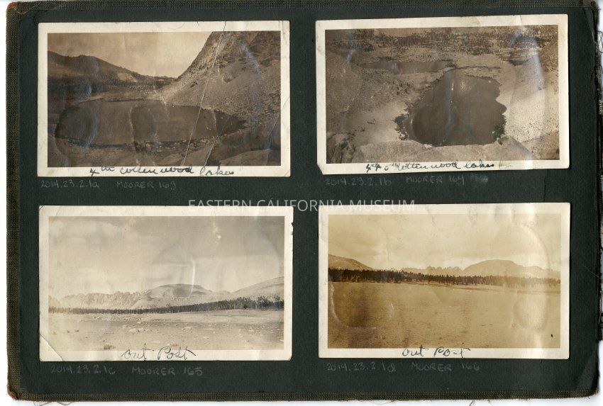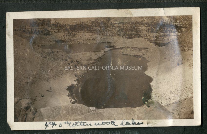 Handwritten in black ink label identifies this photo as Fourth and Fifth Cottonwood Lakes. Two smallish lakes surrounded by rocks. Trees in distance.Collection
