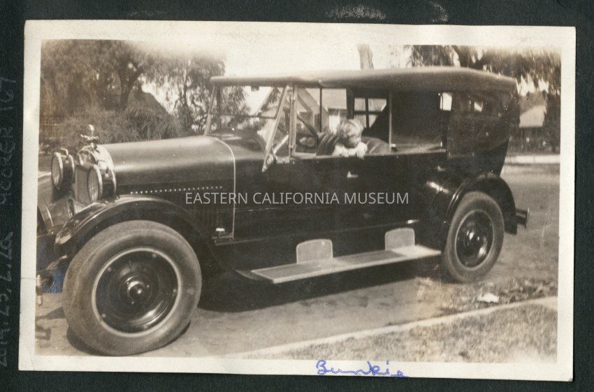 Young child sitting in the driver's seat of a fancy vehicle parked at a curb. Handwritten in blue ink label identifies child as "Bunkie."