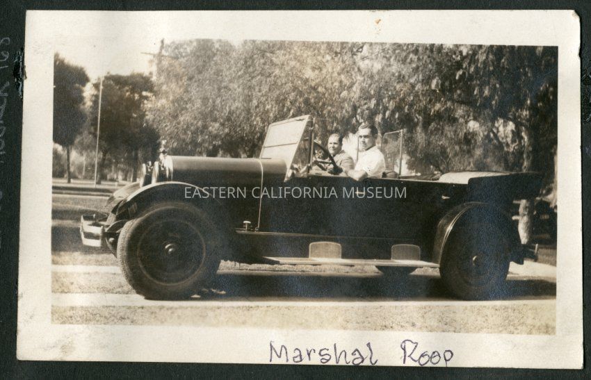 Two men sitting in a convertable that is parked in a driveway. Handwritten in black ink label identifies one of the men as "Marshal Roop."