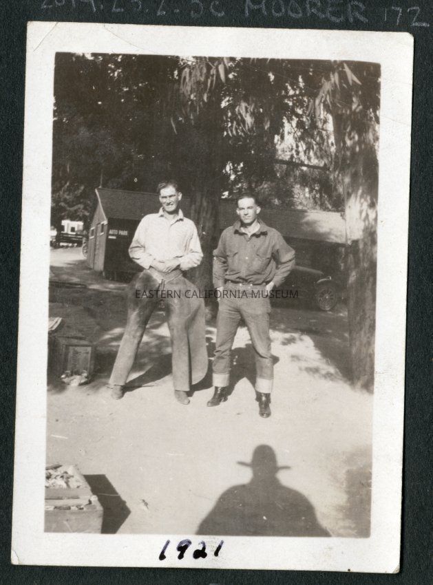Two men standing in front of a cabin. There is a car behind them, boxes around them, and the photographer's shadow is visible. One of the two men is wearing chaps. It is possible Fred Moore took this photo.Collection