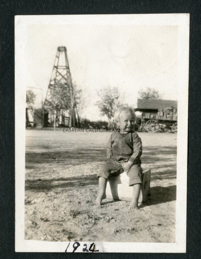 Small child (toddler) sitting on a box with wagon, structure, and windmill or rig in background. Possibly same child seen in MOORER 178.