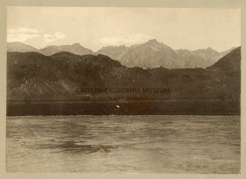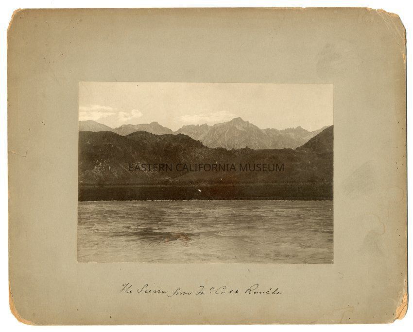 Mounted photo (photo is 7.5 x 4.5", overall size including mounting is 8 x 10") showing Diaz Lake with Sierra in the background. Caption reads, "The Sierra from the McCall Rancho."