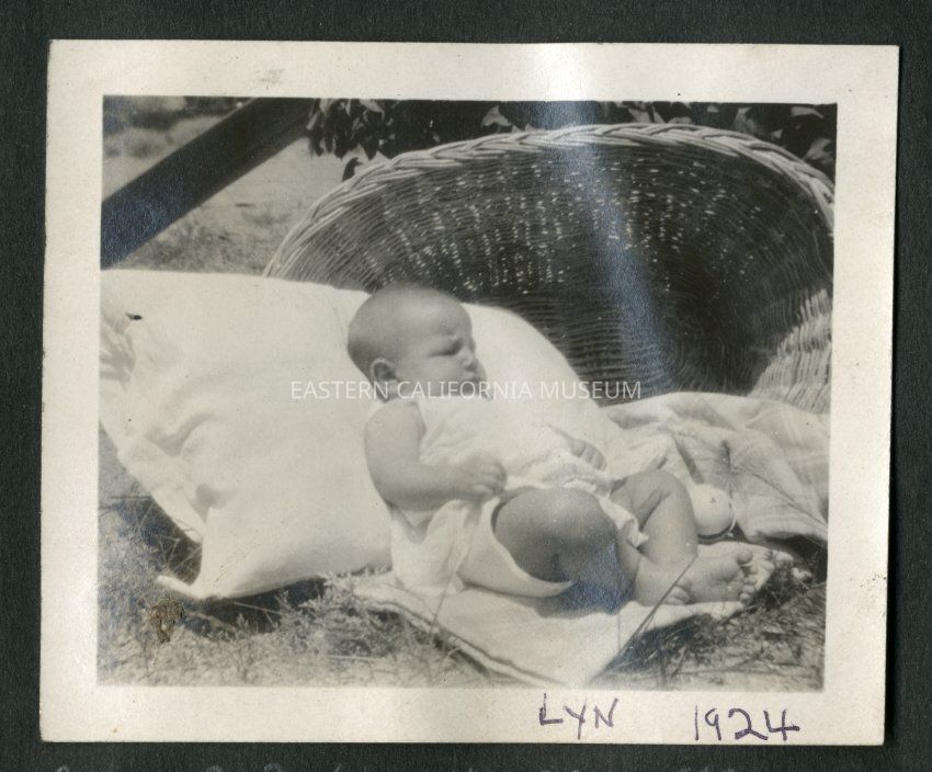 Handwritten in black ink identifies this baby as "Lyn." Baby is laying on a blanket and pillow with a basket propped up behind.