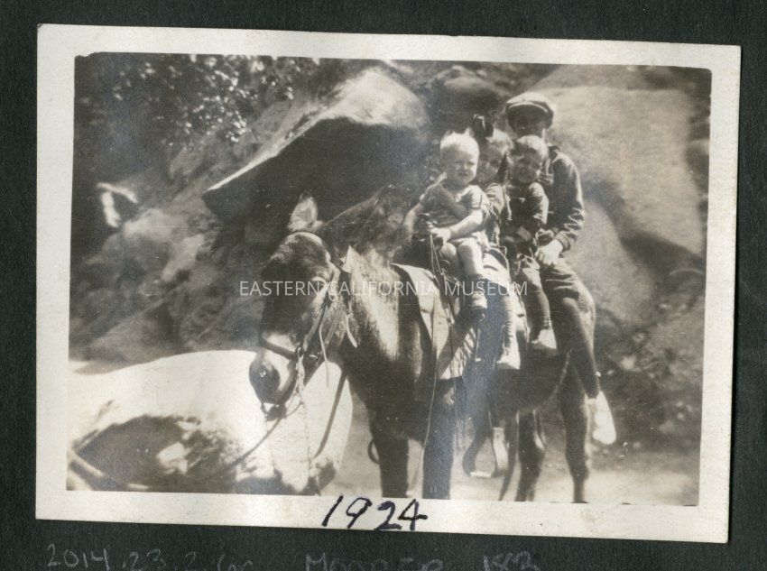 Four children sitting on a saddled donkey/mule/burro/whatever.