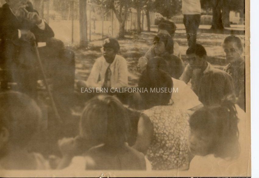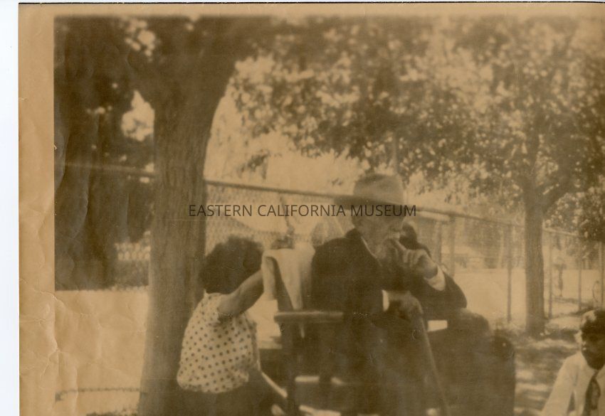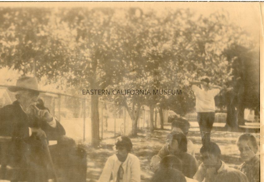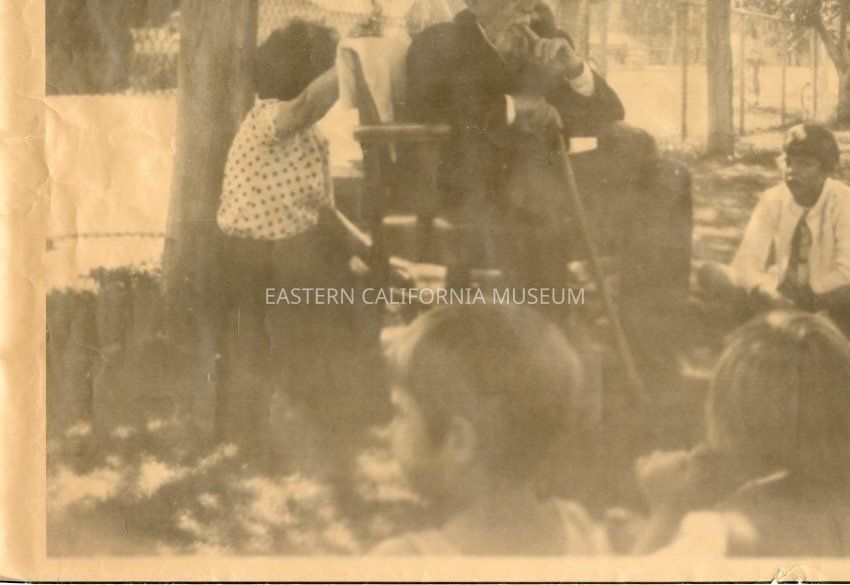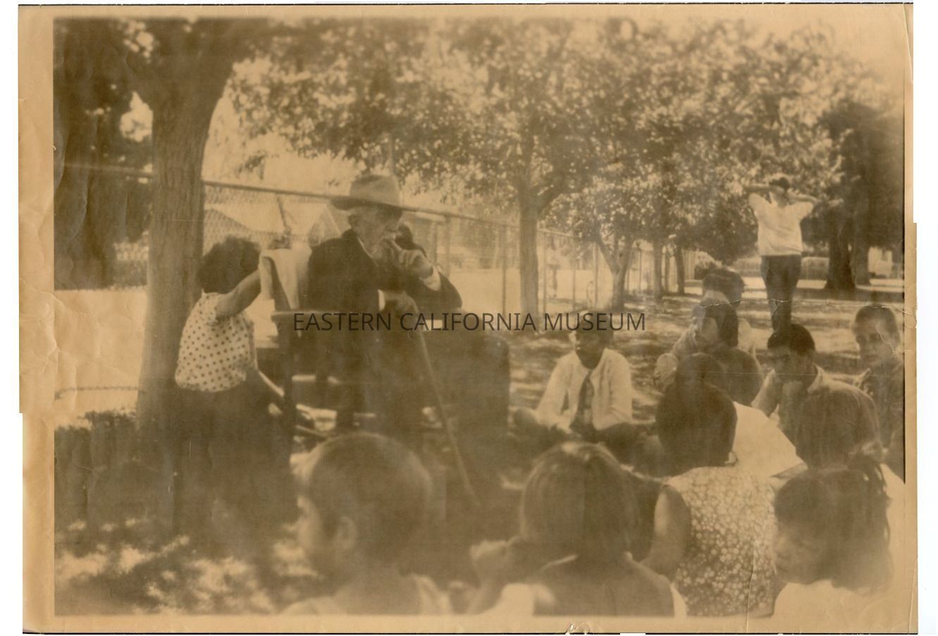 Sepia toned photo of John Lubken sitting in a chair outside telling elementary school children stories of steamboat Bessie Brady [and the Molly Stevens?] on Owens Lake.