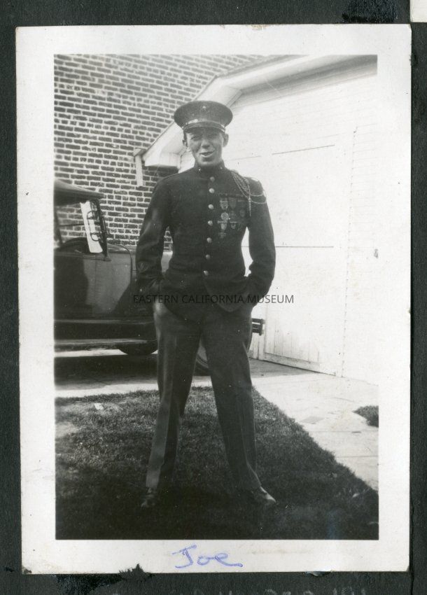 Handwritten in blue ink identifies this man as "Joe." Man wearing a uniform with several medals on chest and braid on left shoulder. Posing in front of a garage with a vehicle in the background.Collection