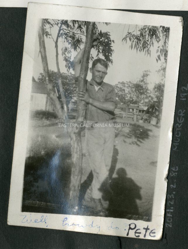 Handwritten in blue ink label says, "Well, howdy do?" Handwritten label in black in identifies this man as "Pete." Man leaning against a young tree with several buildings and a fence in the background. The photographer's shadow is visible in the photo.Collection