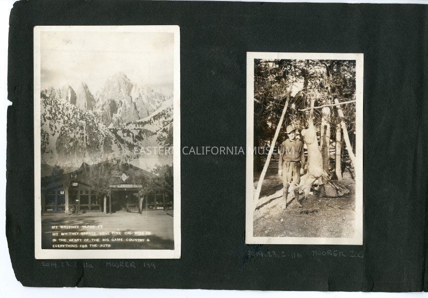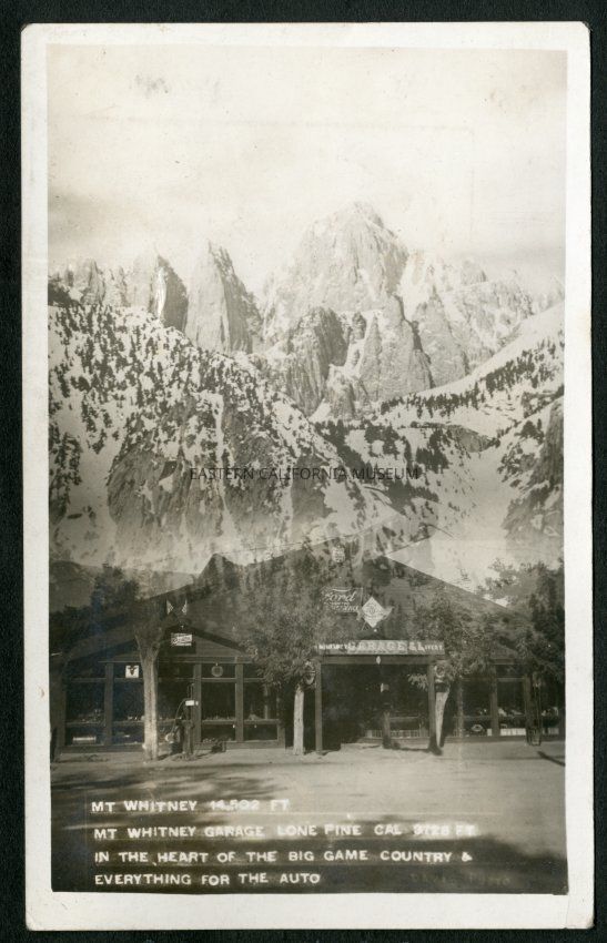 Postcard photo with the caption, "Mt. Whitney 14, 502 ft. / Mt. Whitney Garage, Lone Pine, Cal., 3728 ft. / In the heart of the big game country and everything for the auto." It also has in fainter writing, "Davis Photo." The photo is composed of two superimposed images. One of a close-up of Mt. Whitney covered in snow and the second is of the Mt. Whitney Garage and Livery. There is a sign saying "Ford Authorized Service" on the side of the building.Collection