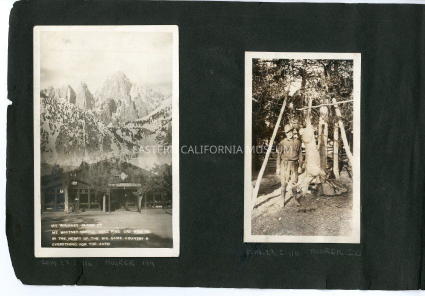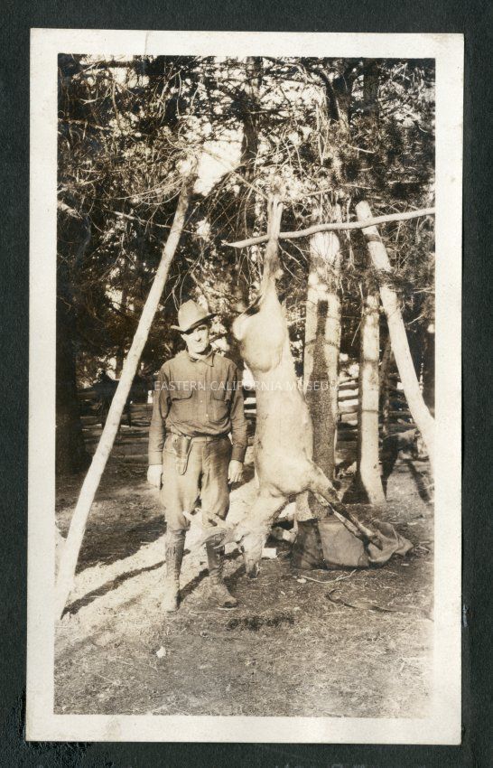Similiar to MOORER 197, MOORER 230, and MOORER 231. Man posing next to a dead deer hanging from a tree.