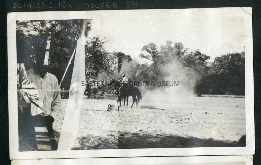 This photo looks like something went wrong when being developed. Man on horse kicking up a cloud of dust in center of a dirt area. TWo other men standing to the left of the photo.Collection