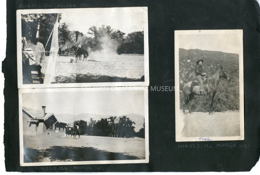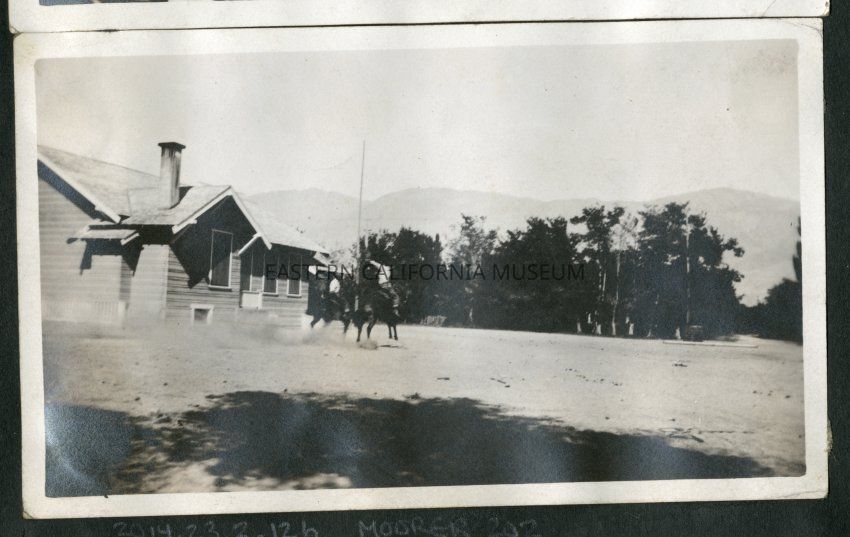 Similiar to MOORER 151 and MOORER 262. Two people on horses by a house. One of the horses appears to be bucking. One of the riders is probably Fred Moore.Collection