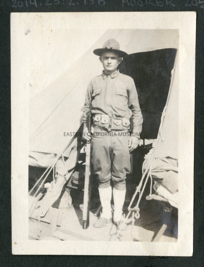 Man in military uniform holding a rifle standing outside a tent. Must be World War I.