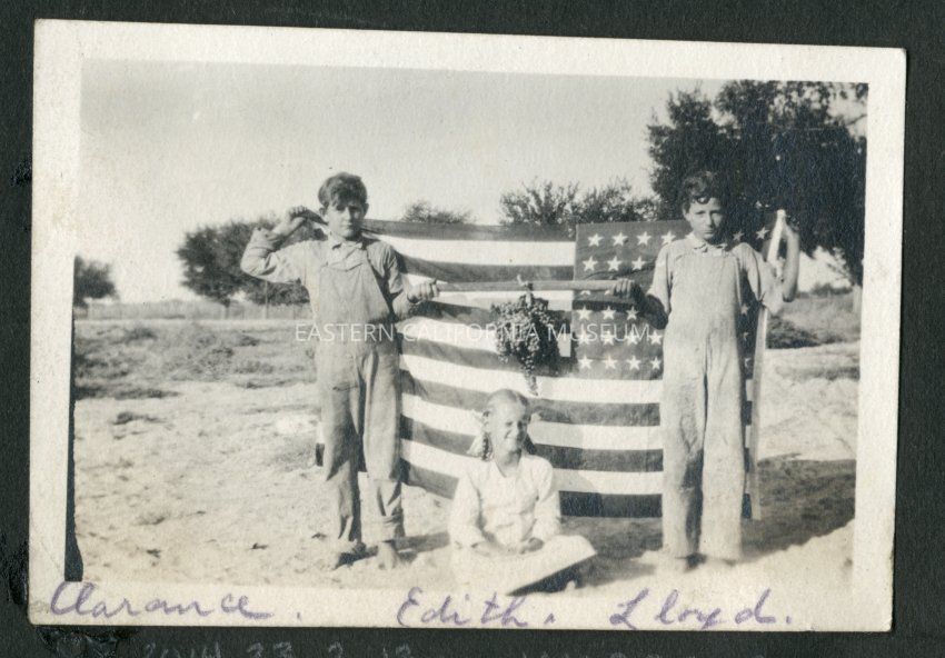 Three children posing with a U.S. flag and a bunch of grapes. Two boys are holding the flag behind their backs and also holding a pole from which a large bunch of grapes has been tied. A young girl wearing white is sitting beneath the grapes. Handwritten label identifies them from left to right as Clerance, Edith, and Lloyd.Collection
