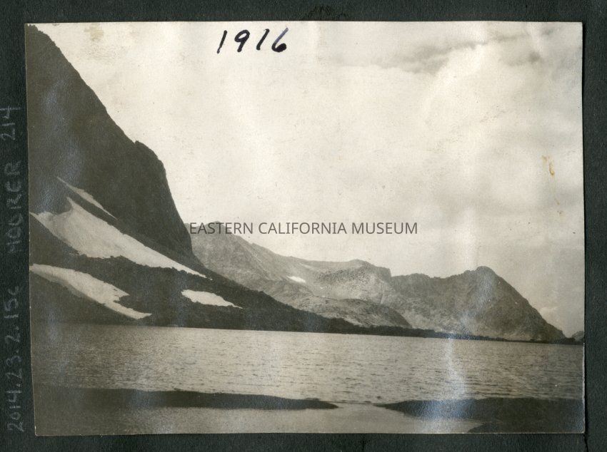 Lake surrounded by steep mountains with patches of snow.