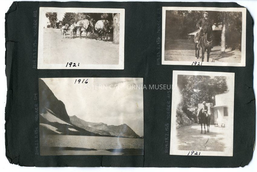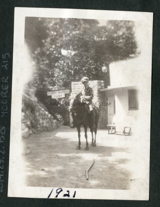 Younger boy mounted on a small pony or horse. There is a building behind him and signs that say "first water camp" and "cabins for..." and "grocery."Collection