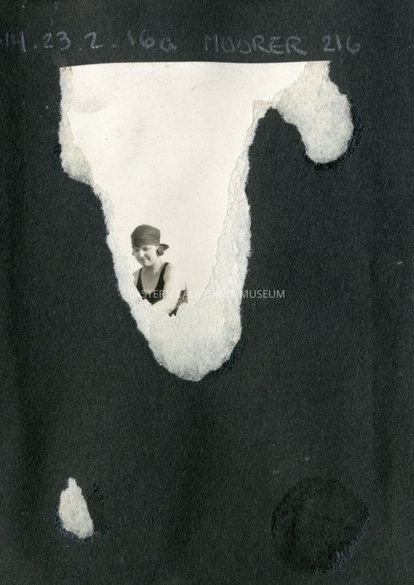 This photo was mostly torn out, but I am including it because there is still a clear image of a young woman wearing a scarf or bathing cap on her head, and a black sleeveless outfit--possibly a swimsuit.Collection