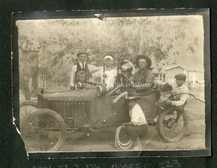 This photo has a black border and features a group of seven people posing in and around a vehicle. Looks like Fred Moore behind the wheel and Rena Beth Moore sitting beside him. The two young boys posing in foreground are especially endearing.Collection